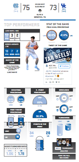 North Carolina took control with 12 straight points over the final 5 minutes, a run similar to what it used a week ago to beat Arkansas. The Tar Heels finished this game with a 16-9 run. Kentucky's freshmen De'Aaron Fox and Malik Monk hit three quick 3s, the last two by Monk. Monk's second shot with 7.2 seconds left and defenders in his face tied it up at 73.