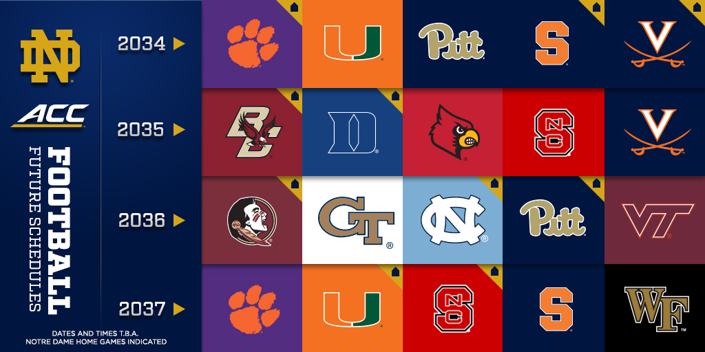 Half of the 60 games scheduled from 2026 through 2037 will be home games for ACC teams, and Notre Dame will play host to 30 games. Highlights include Labor Day Monday night games at Clemson on August 30, 2031 and at Virginia Tech on September 1, 2036.