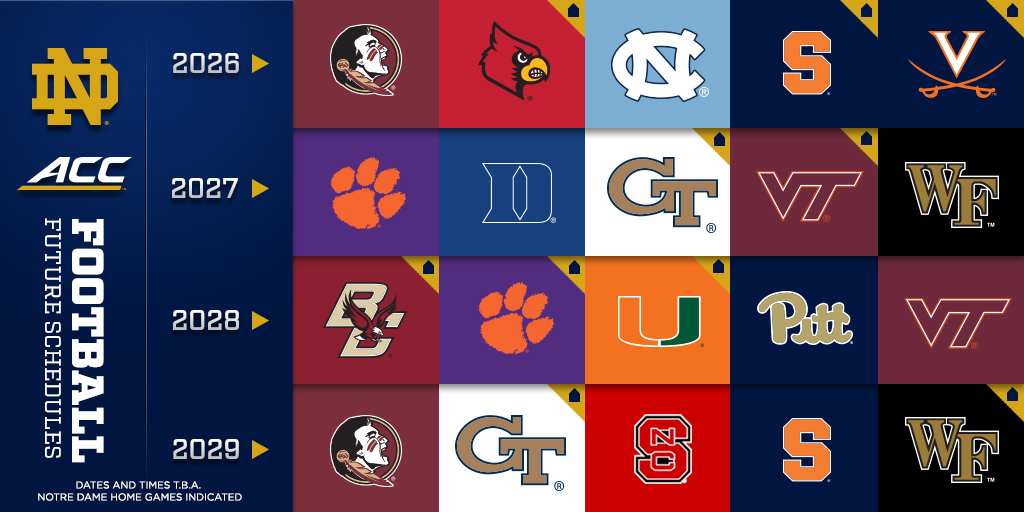 GREENSBORO, N.C. (theACC.com) – As part of the ongoing agreement, Notre Dame and the Atlantic Coast Conference announced the five football games that will be played annually between the Fighting Irish and members of the league from 2026 through 2037.