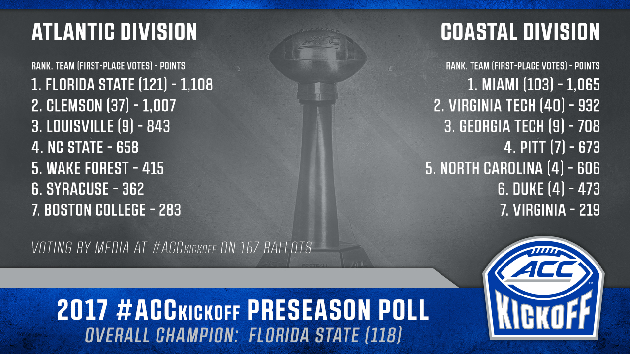 Florida State was named the likely 2017 ACC champions on 118 ballots, followed by defending national champion and two-time defending ACC champion Clemson with 35 votes. Louisville received seven votes, followed by Virginia Tech and Miami with three each and Duke with one.